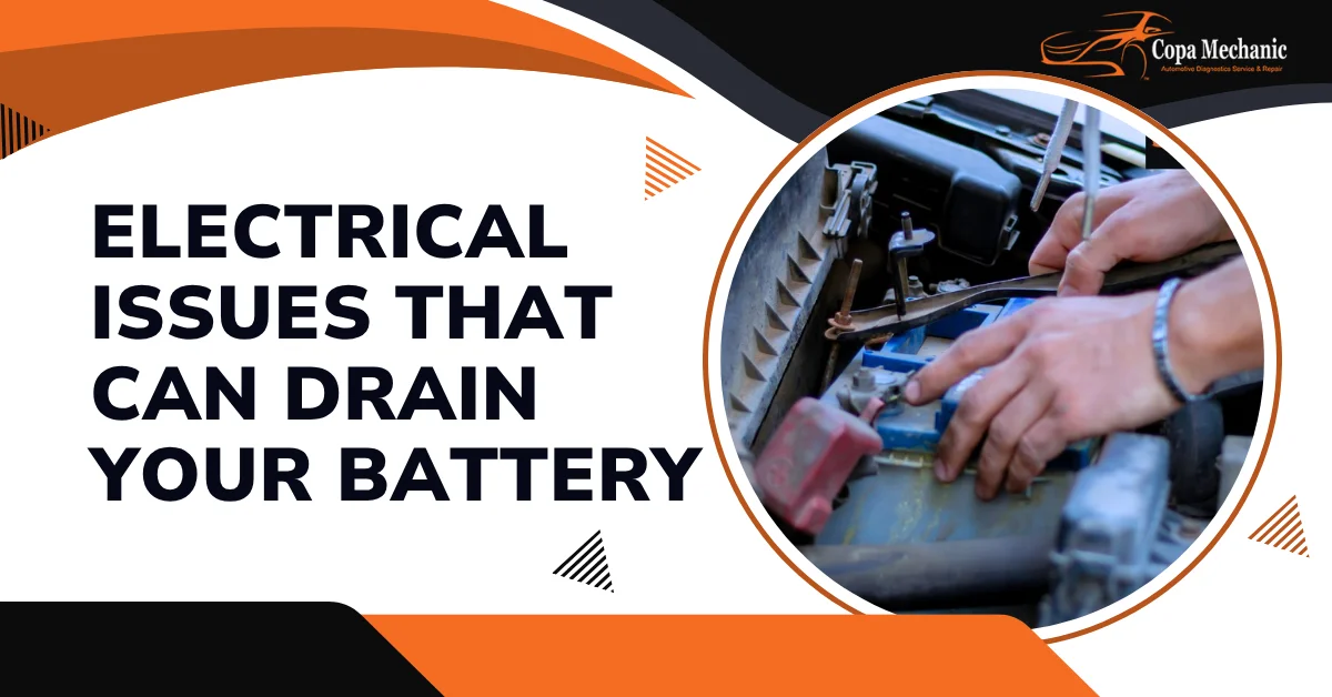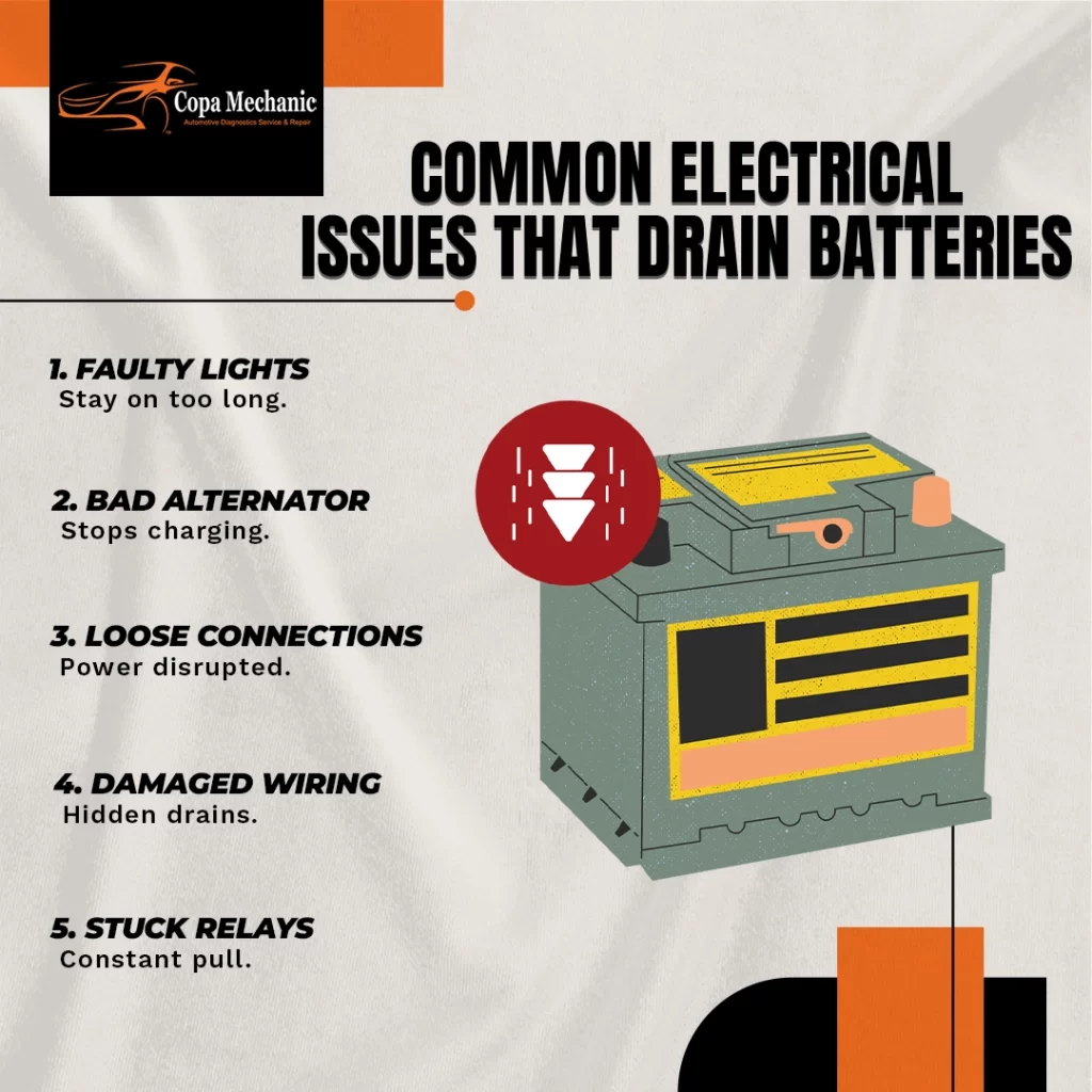 Electrical issues that can drain your battery include faulty lights, a bad alternator, loose or corroded connections, and damaged wiring. Even small things like a light that doesn’t turn off or an aftermarket gadget left plugged in can slowly kill your battery. If your lights flicker, your car struggles to start, or you hear weird noises, it is a sign that something electrical is draining power and needs to be fixed.